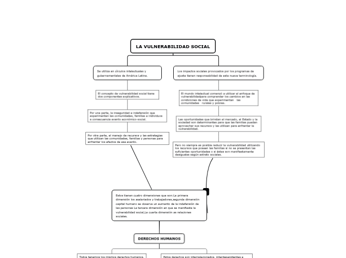 Estos tienen cuatro dimensiones que son:La primera dimensión los asalariados y trabajadores,segunda dimensión capital humano se observa un aumento de la indefensión de las personas La tercera dimensión en que se manifiesta la vulnerabilidad social,La cuarta dimensión as relaciones sociales.